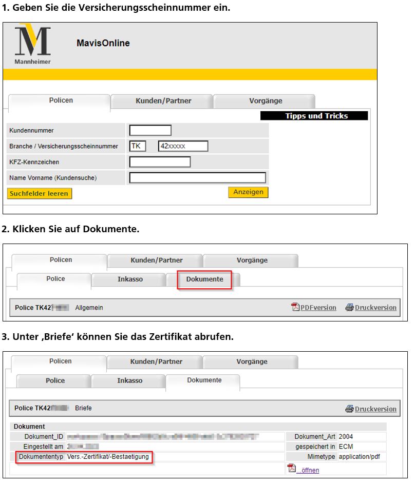 Über MavisOnline können Sie das archivierte Haftpflichtzertifikat abrufen und es dem Kunden bei Bedarf erneut zügig zur Verfügung stellen.